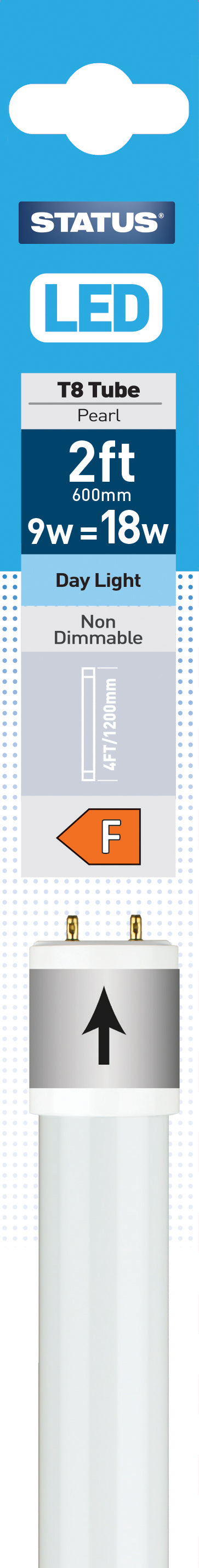 - 2ft/600mm - 9w = 900 lumens - LED - T8 Tube - Pearl - Day Light - 1 pk box