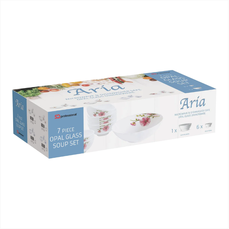 Aria Beautiful Opal 7 Piece White Glass Bowl and Soup Set Blue Floral